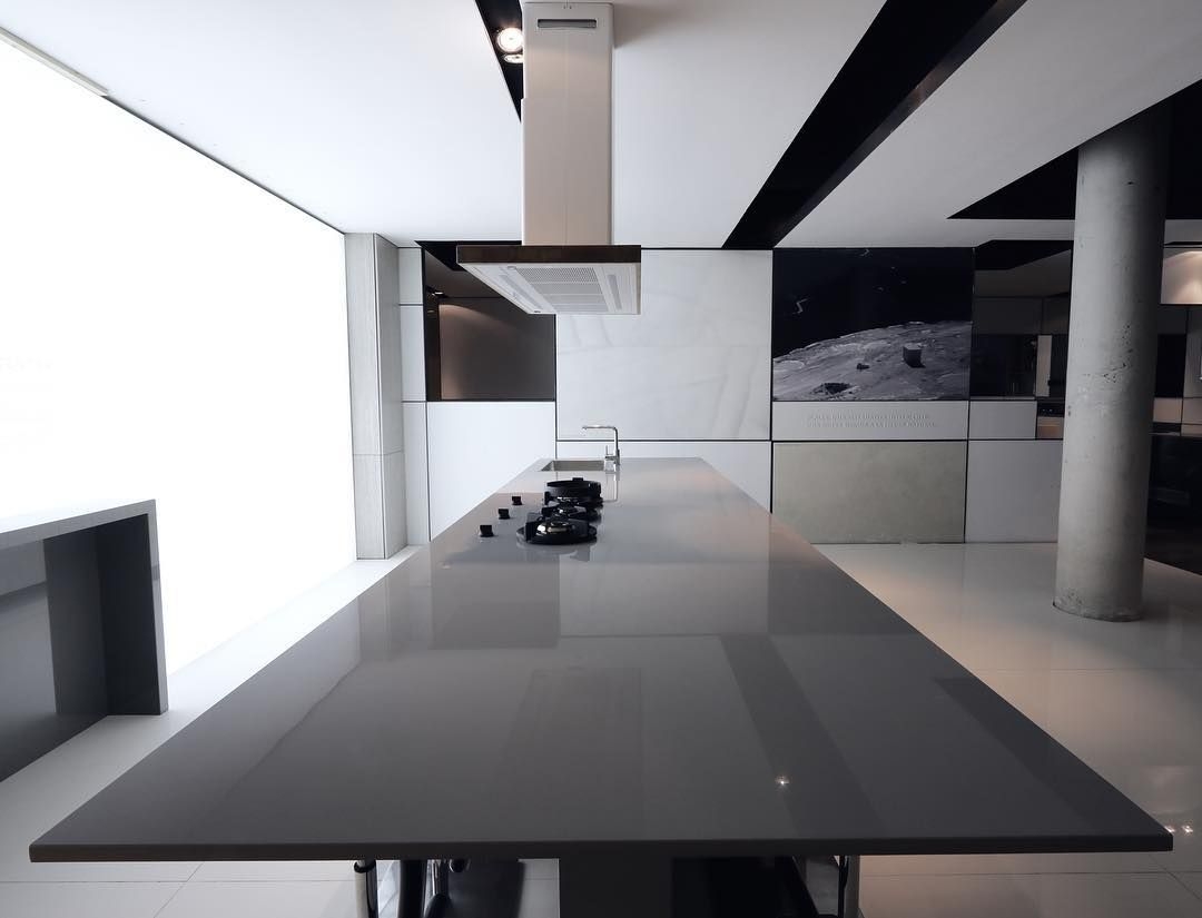 Dekton Blaze  de un gris oscuro liso con un tinte metálico. Blaze XGloss es un gris intenso potenciado por su brillo deslumbrante.
