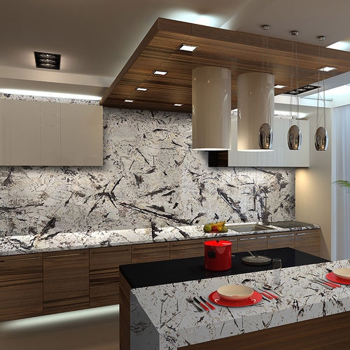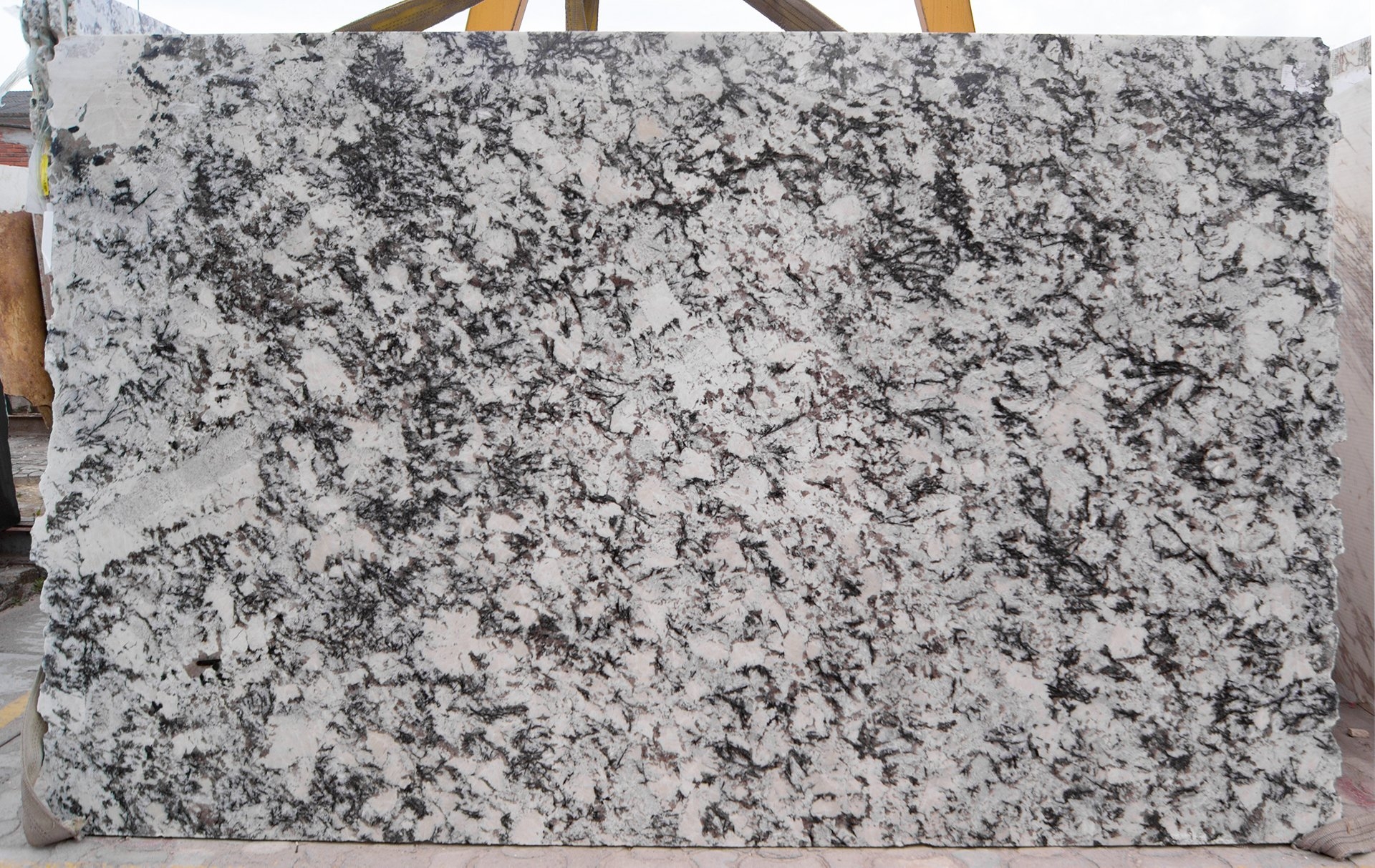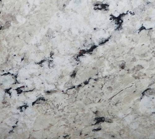 Granito de fondo blanco sobre el que se acumulan tonos azulados y cremas marcados con vetas grises y negras.