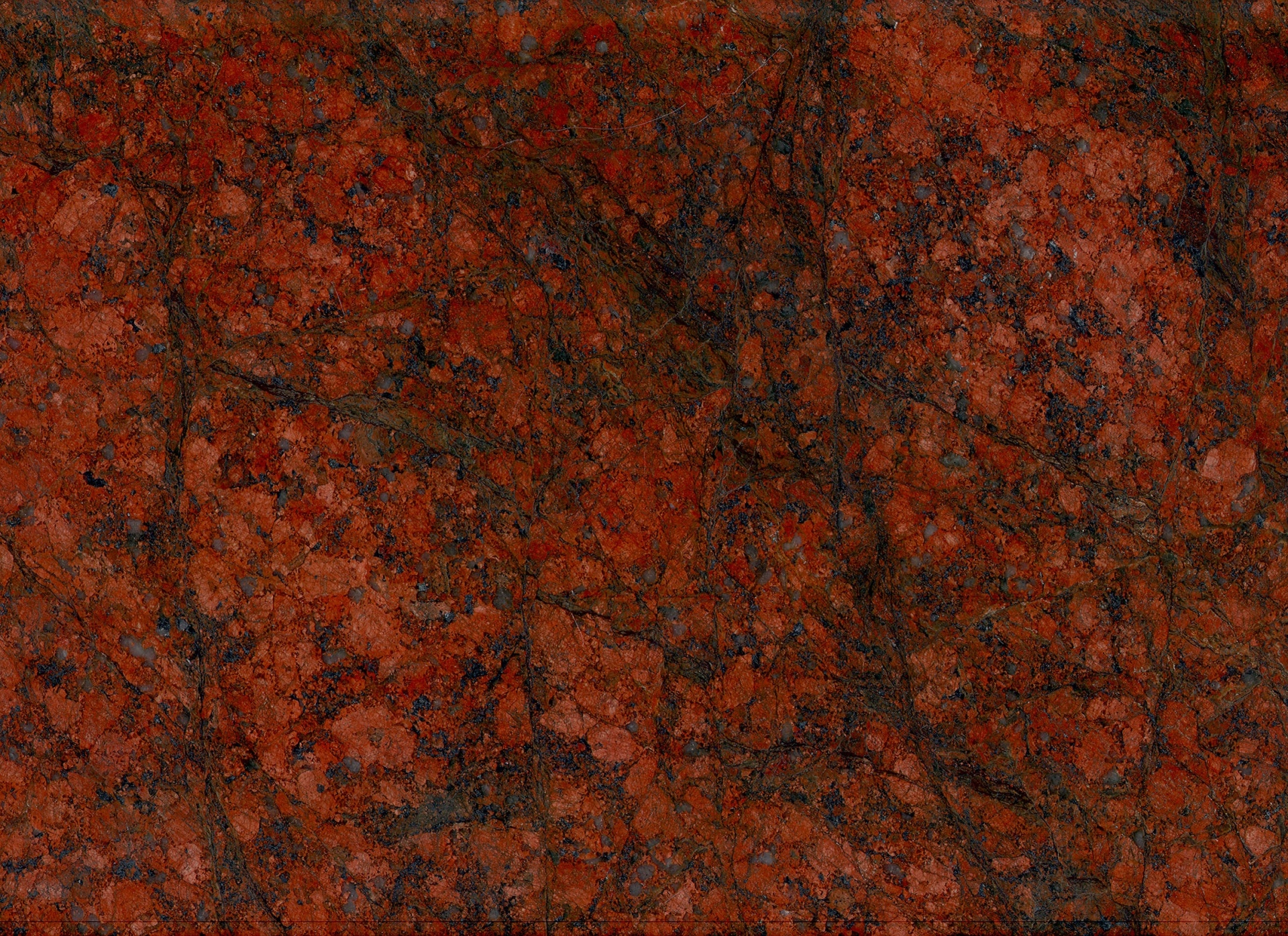 Es un granito con interesantes granos grises y rojos, cruzados por venas oscuras
