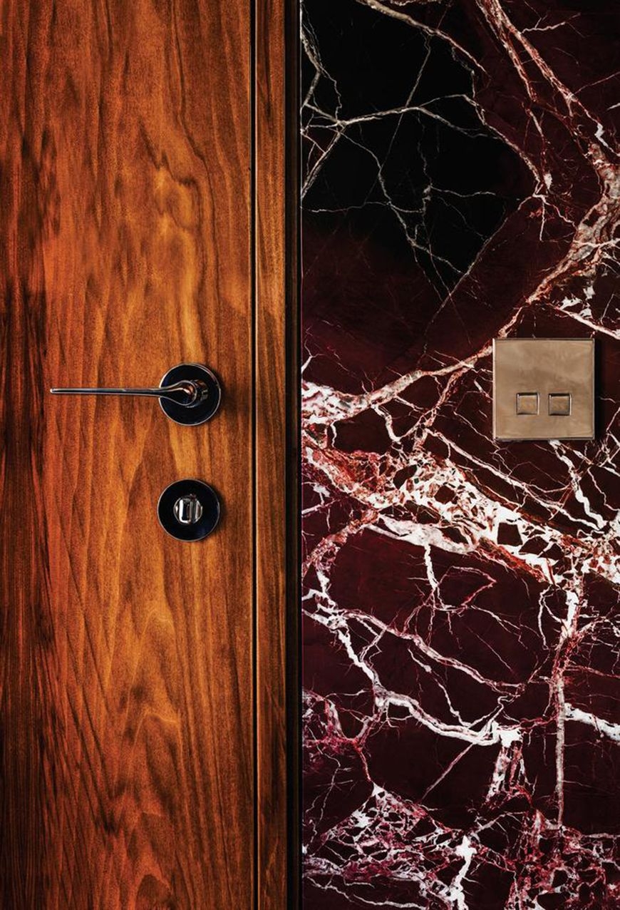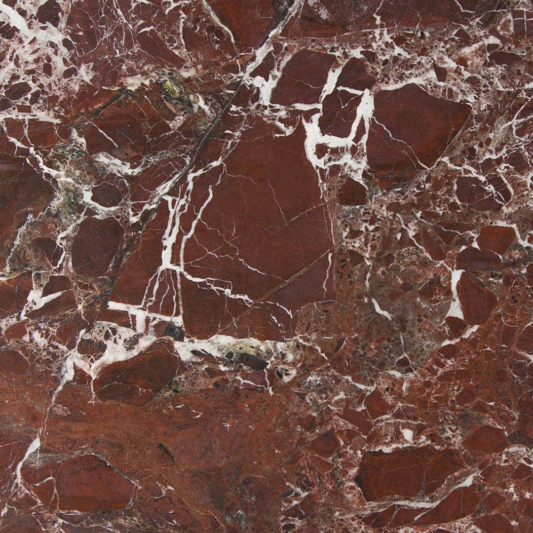 Es un mármol con un color rojo intenso muy oscuro, con tendencia al violeta, con vetas largas y separadas en tonos blancos que lo atraviesan por toda su superficie.