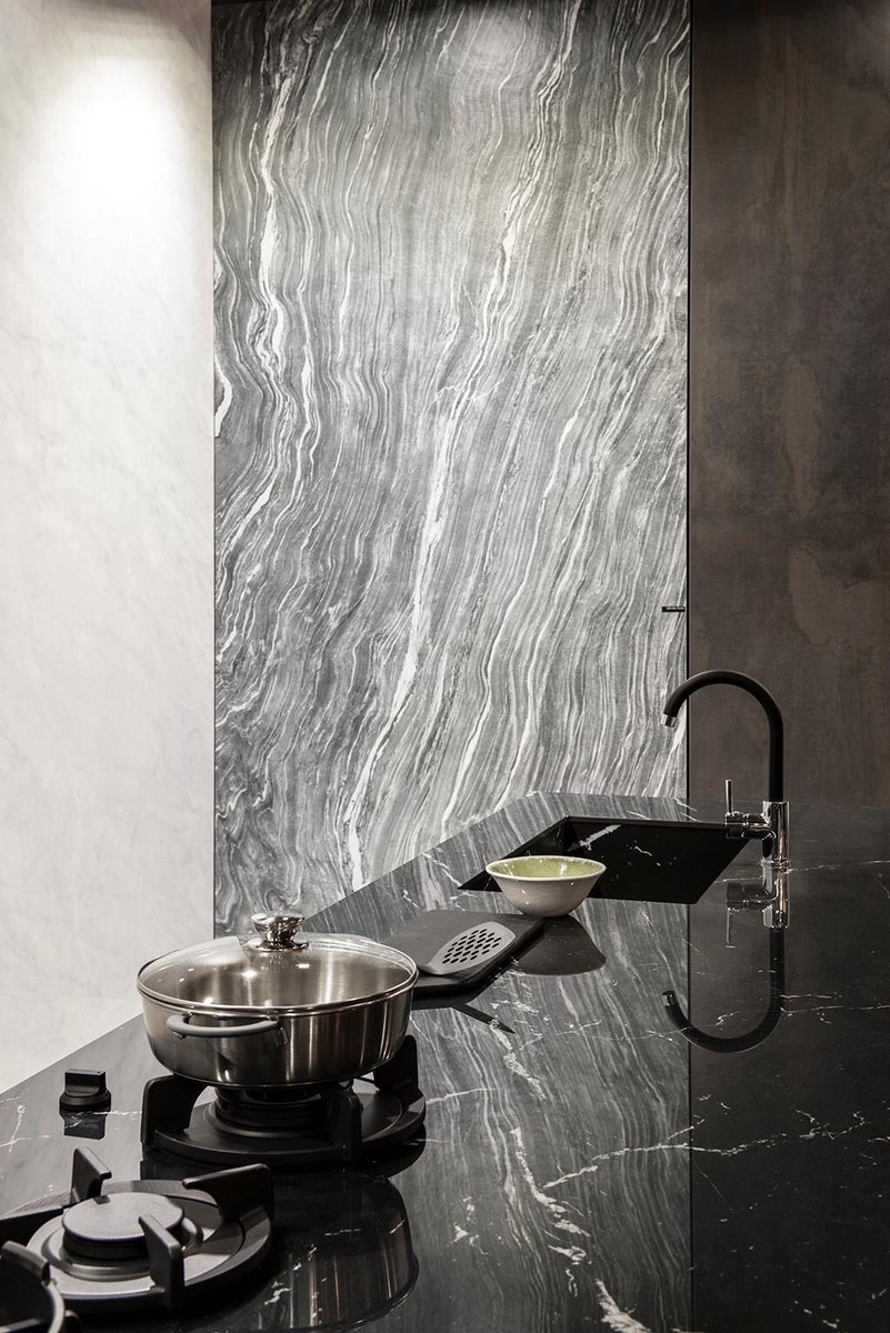 Inspirado en el exótico granito Dark Pearl, una piedra brasileña, este estiloso y ondulado modelo incorpora sinuosas bandas de cuarzo blanco sobre un fondo gris. Con un relieve de piedra que recuerda a la pizarra, este modelo constituye una fascinante inspiración del agua con una fluidez que recuerda al poderoso caudal de un río sudamericano.