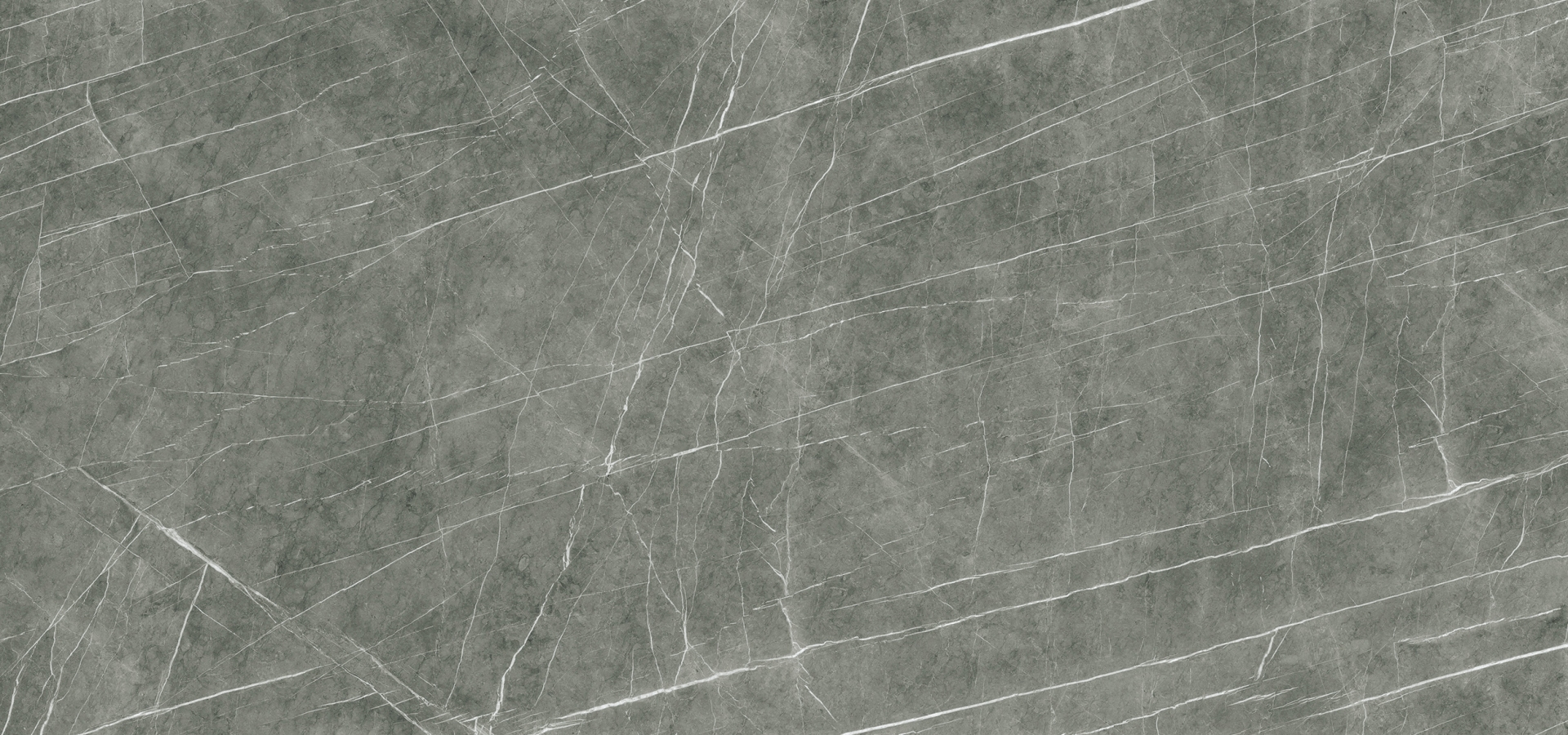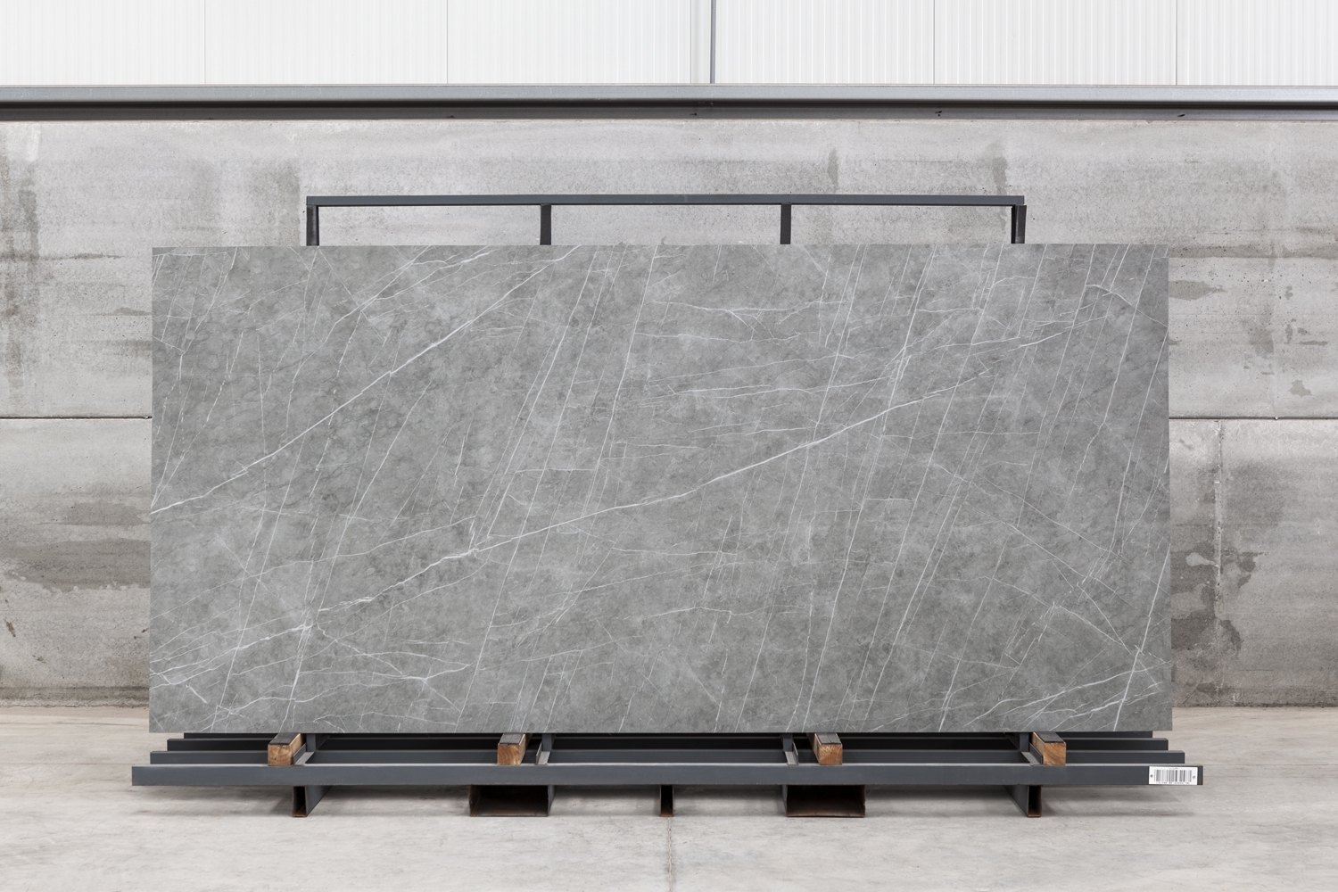Reinterpretación contemporánea de la Piedra Gris Iraní. Incorpora un tono gris más rico, más industrial, con venas blancas que realzan el fondo en direcciones contrapuestas.