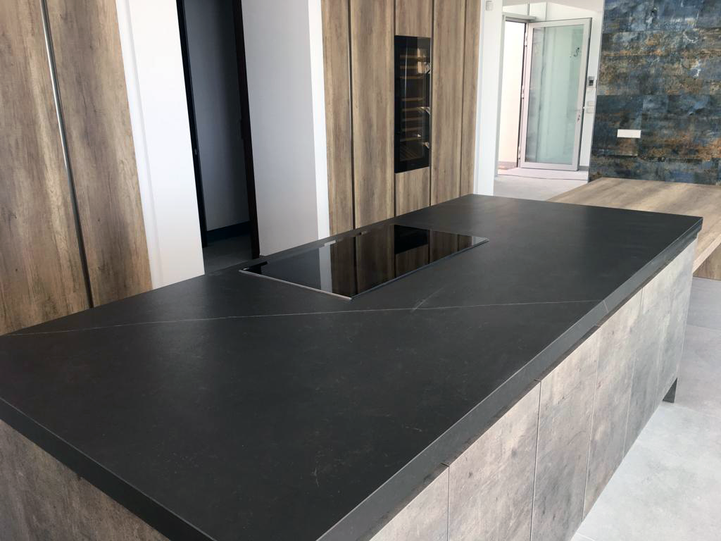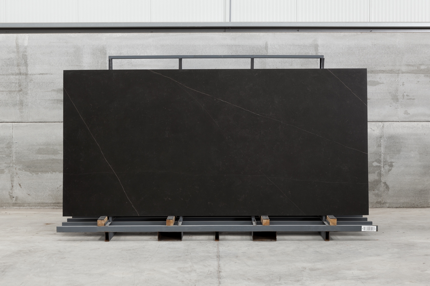 Inspirado en la piedra caliza Calatorao de color gris de brillantes vetas doradas e intenso color gris oscuro.